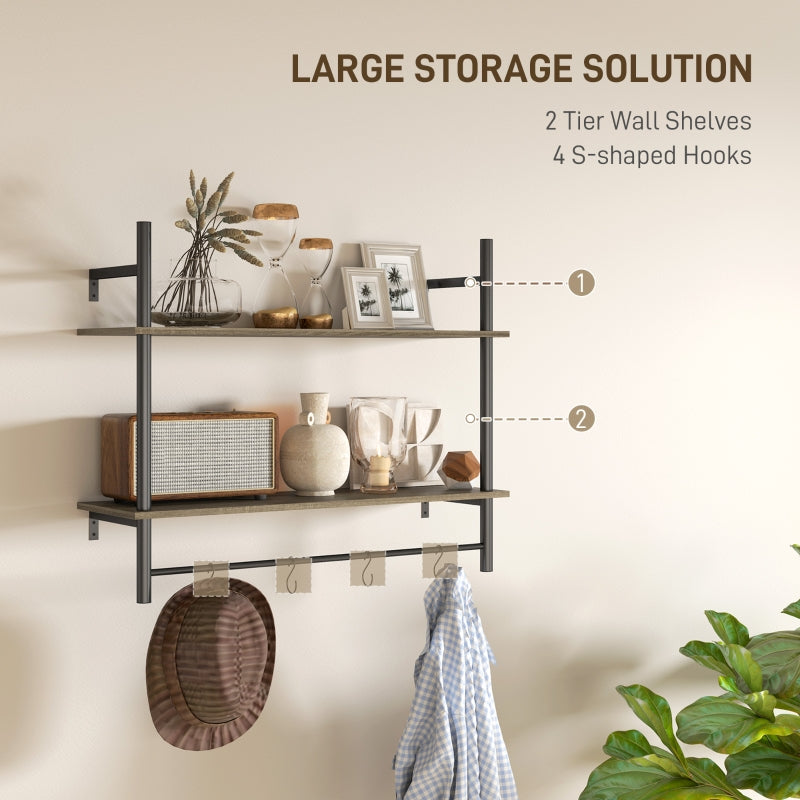 Wall Mounted Floating Shelves, Rustic 2-Tier with 4 Hooks, Grey