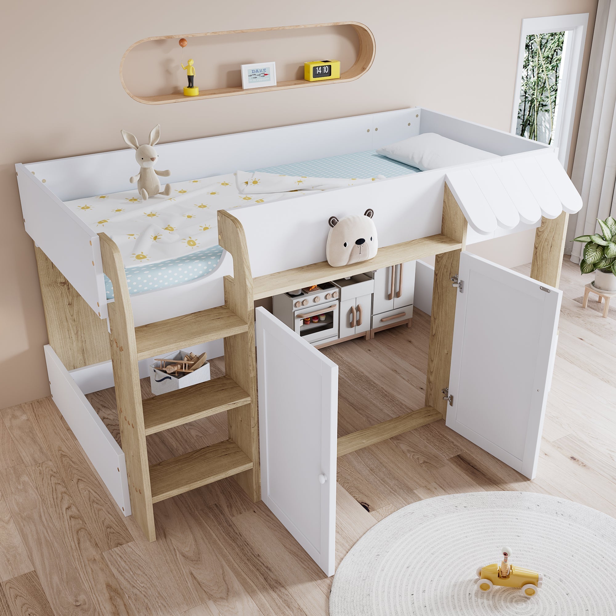 Wooden High Sleeper Bed 3ft Single with Ladder and Storage Cabinets, White Pine + MDF + Plywood