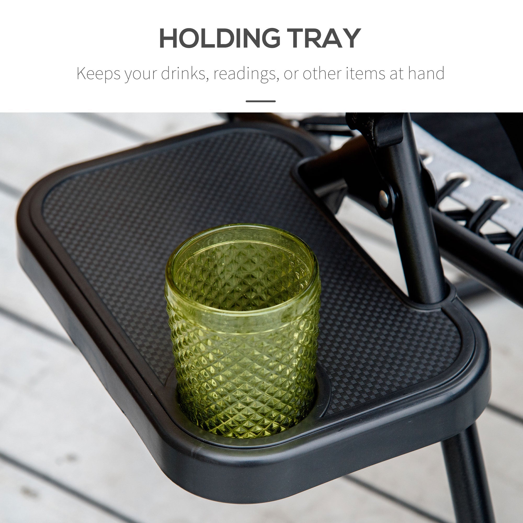The shade canopy keeps you cool as you recline, and the tray with a cup holder allows easy access to drinks, magazines, phones, tablets, and other small items.